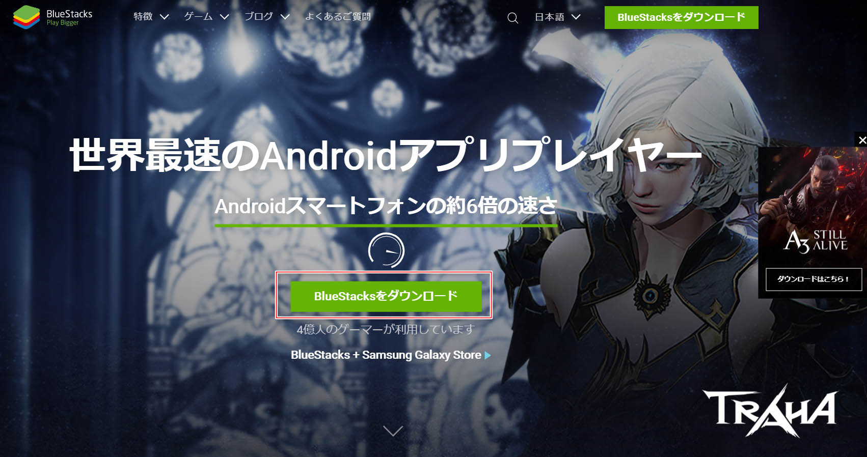 以下のリンクからBlueStacksの公式サイトへ移動します。