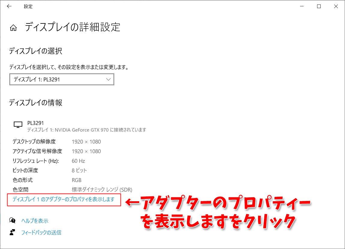 「ディスプレイの詳細設定」が開くので、その中から「ディスプレイ1のアダプターのプロパティを表示します」をクリックします。