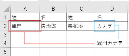 つなげようとしている姓「竈門」はA2のセルに入っています。