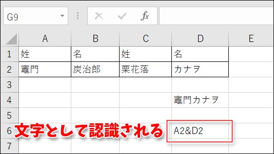 ただし、「A2&D2」と打っただけだと、文字として認識されてしまうので、先頭に「=」をつけて、参照していますということが分かるようにします。