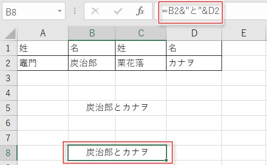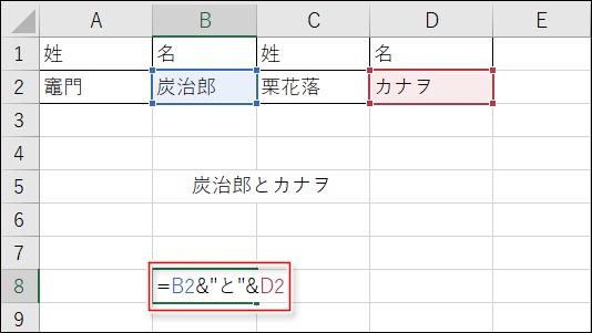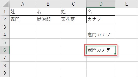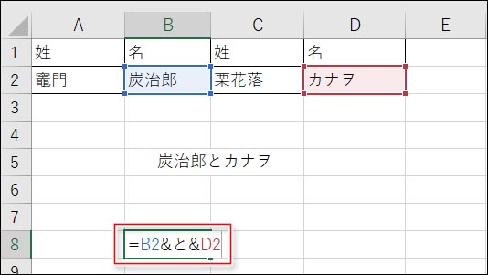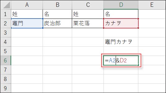 結合したい名の「カナヲ」はD2のセルに入っていますね。