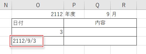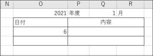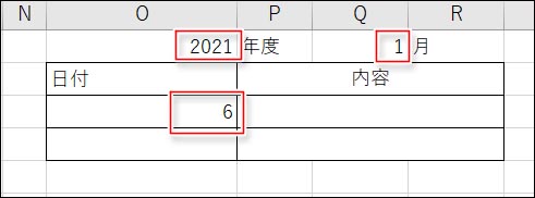 例えば、上の表のように、「年」「月」「日付」が離れていた場合に、日を入力するだけで年月日も表示されるようにしたい時、年月日が表示されるようにするには