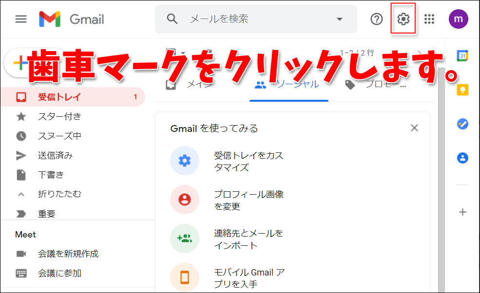 gmailの画面に切り替わると、上のほうに歯車マークがあるのでクリックします。