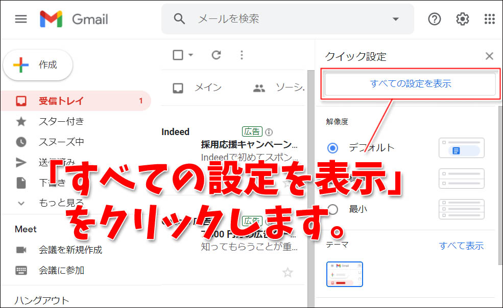 「クイック設定」の文字の下に「すべての設定を表示」というボタンがあるのでクリックします。