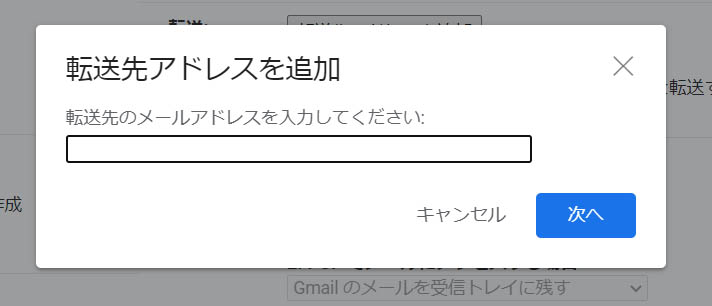 「転送先アドレスを追加」というウィンドウが表示されるので、この枠の中に転送したいメールアドレスを入力します。