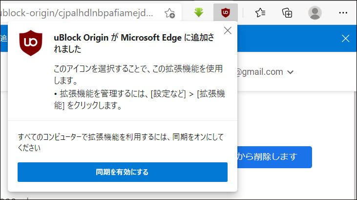 uBlockOriginがMicrosoftEdgeに追加されました、と表示されて導入完了です。