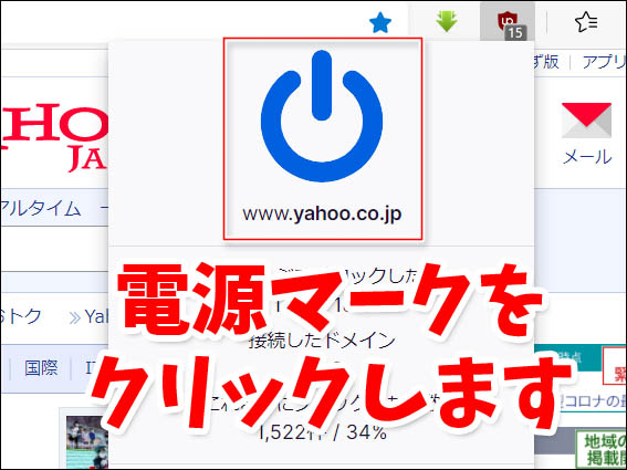 uBlockOriginがオフになっている状態で、もう一度電源ボタンをクリックすると再びオンになります。